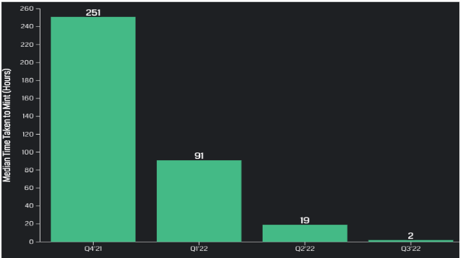 Regardless of this stark difference in mint durations, there are obvious positives, as NFT mints (whether free or paid) have become significantly faster over the last 12 months. Median NFT minting durations decreased to 2 hours in Q3 2022, down from 19 hours (89 percent) in Q2 2022 and, a combined 12.5x improvement from Q4 2021 when it took an average of 251 hours to mint.