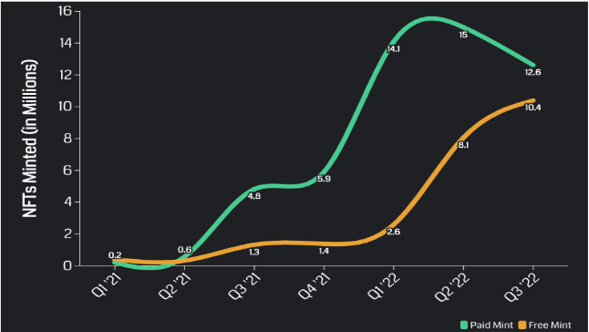 Q3 2022 witnessed an increased affinity for free mint NFTs over paid mint in the NFT community, further underlining the shift in mint structure for projects away from paid mints to increase the number of new entrants to the market.