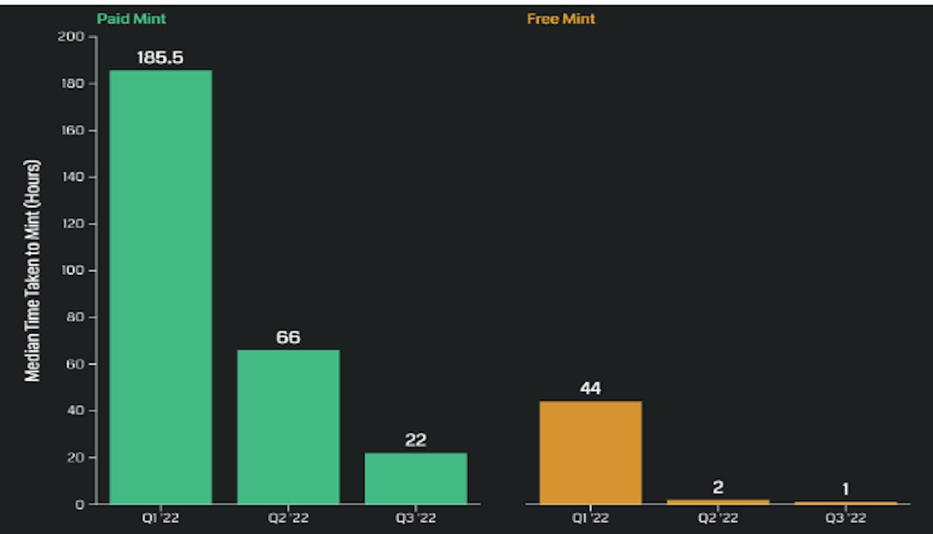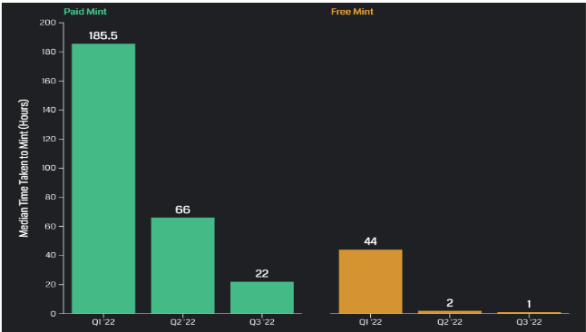 Free mints took a median time of just one hour to complete minting in Q3, 98% less time than the the 44 hours it took at the beginning of the year in Q1 2022, while paid mints took 22 hours to complete minting in Q3 2022, 88% less time than the 185.5 hours it took them to mint in Q1 2022. This means that free mints completed 22 times faster than their paid counterparts.